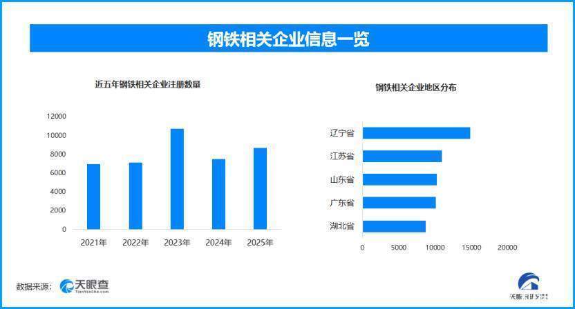 天眼查专业版数据显示,截至目前我国现存在业、存续状态的钢铁相关企业超10.5万家。其中,2025年新增注册相关企业约8600余家,从企业注册数量趋势来看,钢铁相关企业的注册数量平稳发展,其中在2023年达到历史峰值,为超1.07万家。