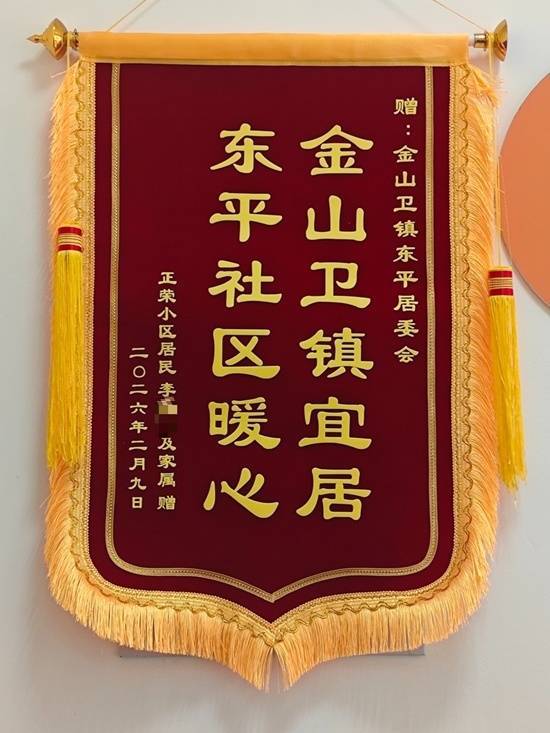 近日,李阿姨专程给金山卫镇和东平居委会送了一面锦旗和一封感谢信。锦旗上“金山卫镇宜居 东平社区暖心”短短两句话,承载了李阿姨一家在此生活十年所感受到的沉甸甸的邻里温情和政府关怀。
